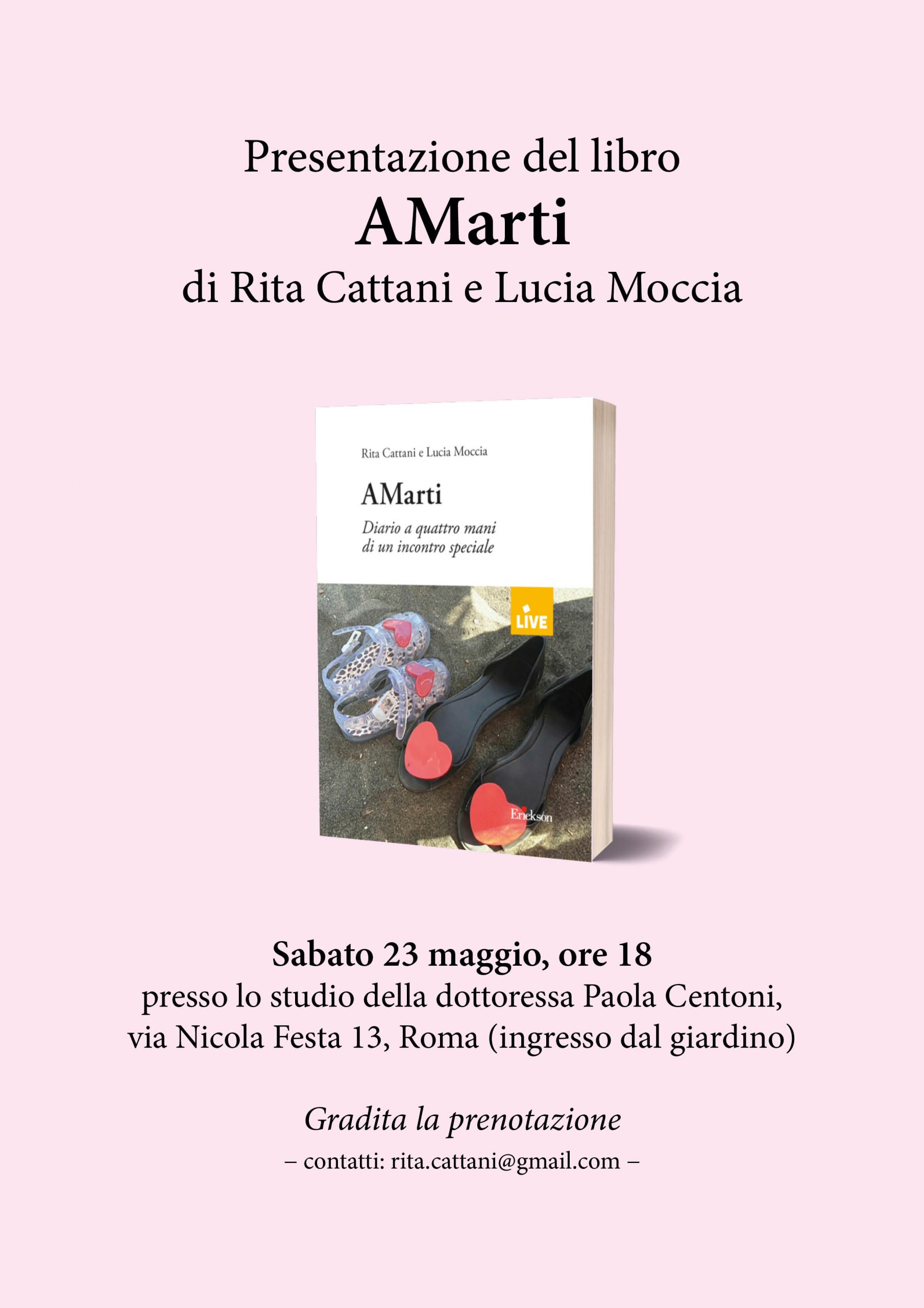 Sabato 23 maggio, alle ore 18:00, presso lo studio di psicoterapia della dottoressa Paola Centoni (Ingresso dal giardino, via Nicola Festa 13A, 00137 Roma), si terrà un incontro con le autrici del libro: “AMarti. Diario a quattro mani di un incontro speciale” di Rita Cattani e Lucia Moccia.