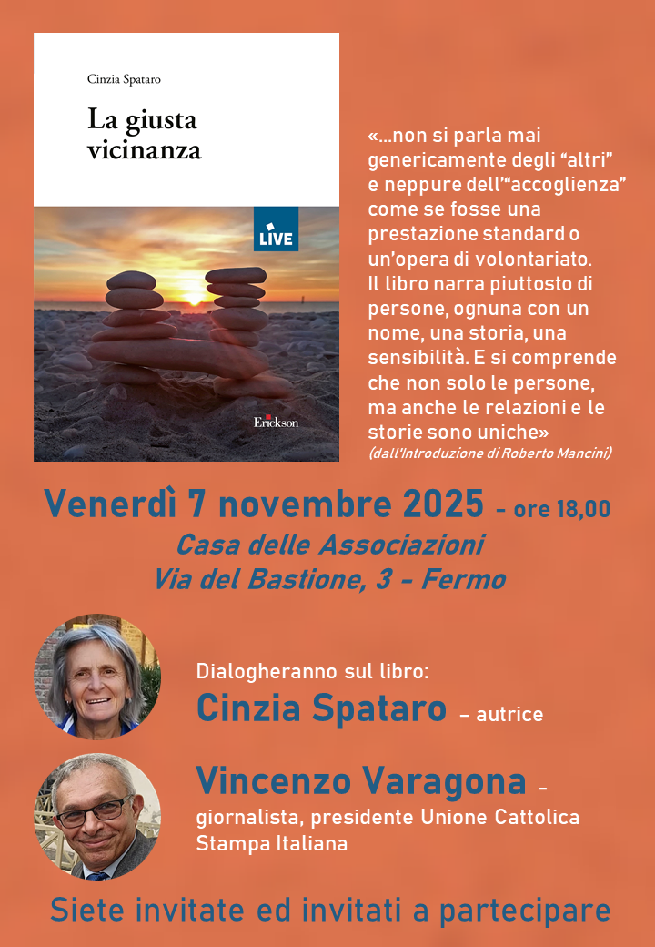Venerdì 7 novembre 2025, alle ore 18.00, presso la Casa delle Associazioni di Fermo (in Via del Bastione, 3) si terrà la presentazione del libro "La giusta vicinanza" di Cinzia Spataro. Insieme all'autrice dialogherà Vincenzo Varagona, giornalista e Presidente Unione Cattolica Stampa Italiana.