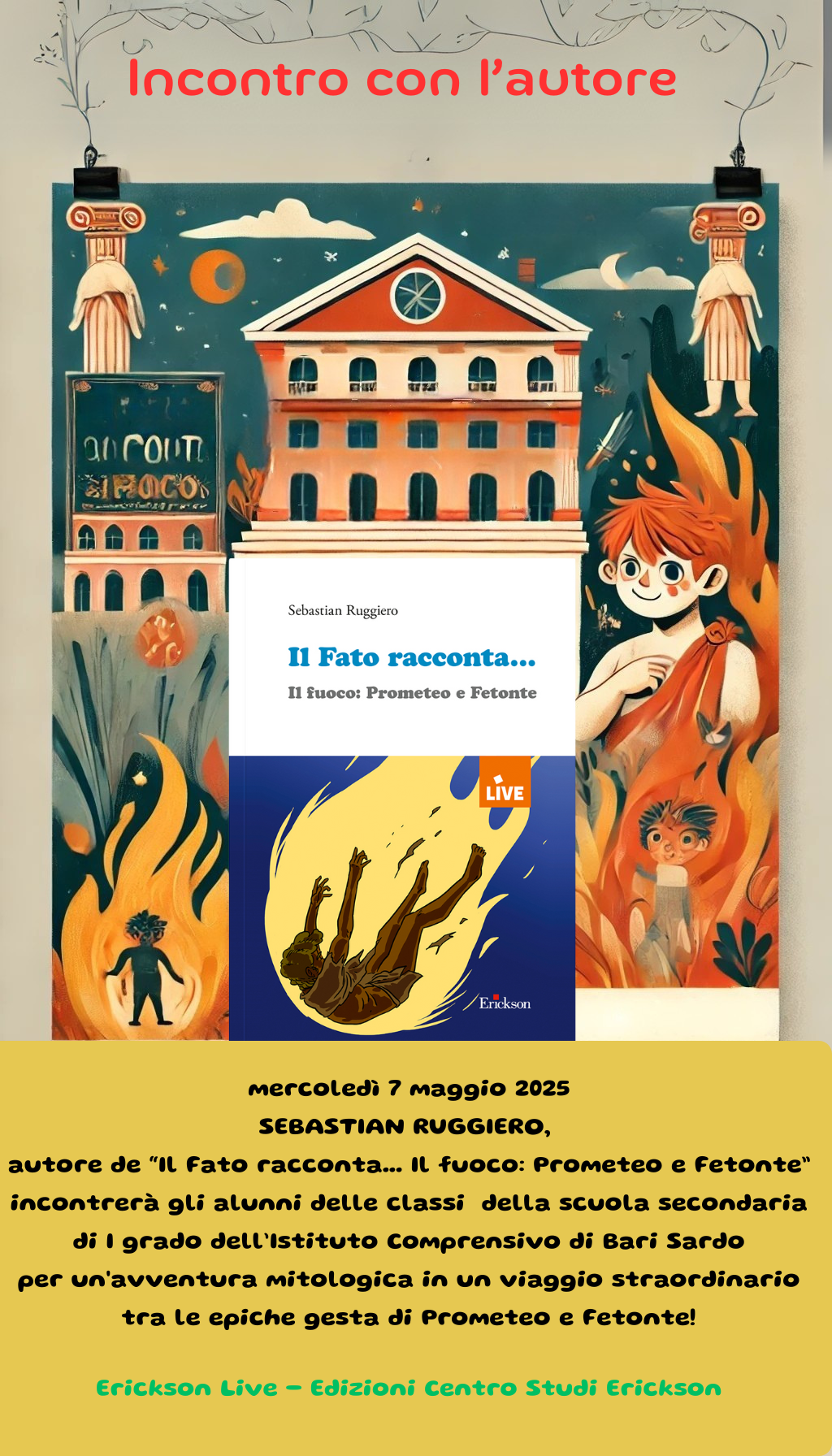 Giovedì 20 marzo e mercoledì 2 aprile Sebastian Ruggiero, autore del libro "Il Fato racconta..." incontrerà gli alunni della Scuola Primaria di Via Garavetti a Cagliari per un'avventura mitologica in un viaggio straordinario tra le epiche gesta di Prometeo e Fetonte!